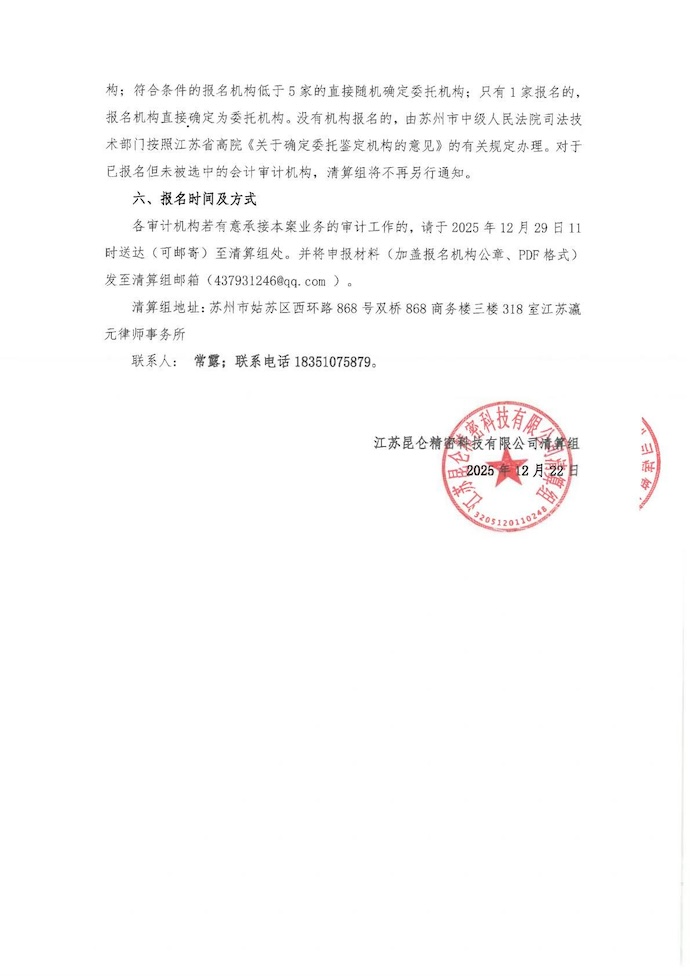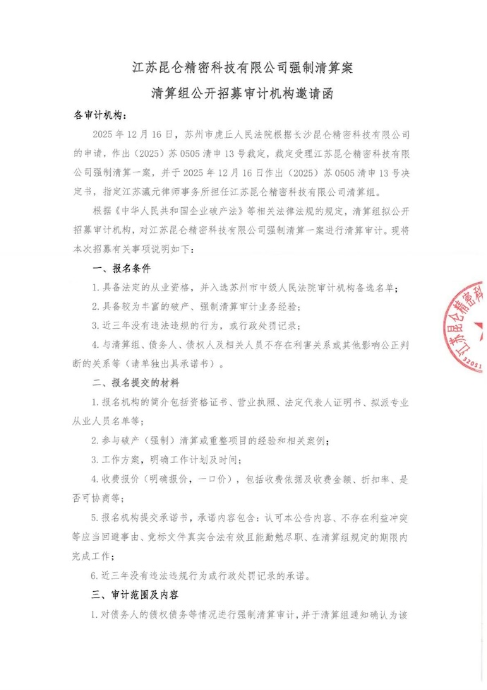 江苏昆仑精密科技有限公司清算案件审计机构邀请函