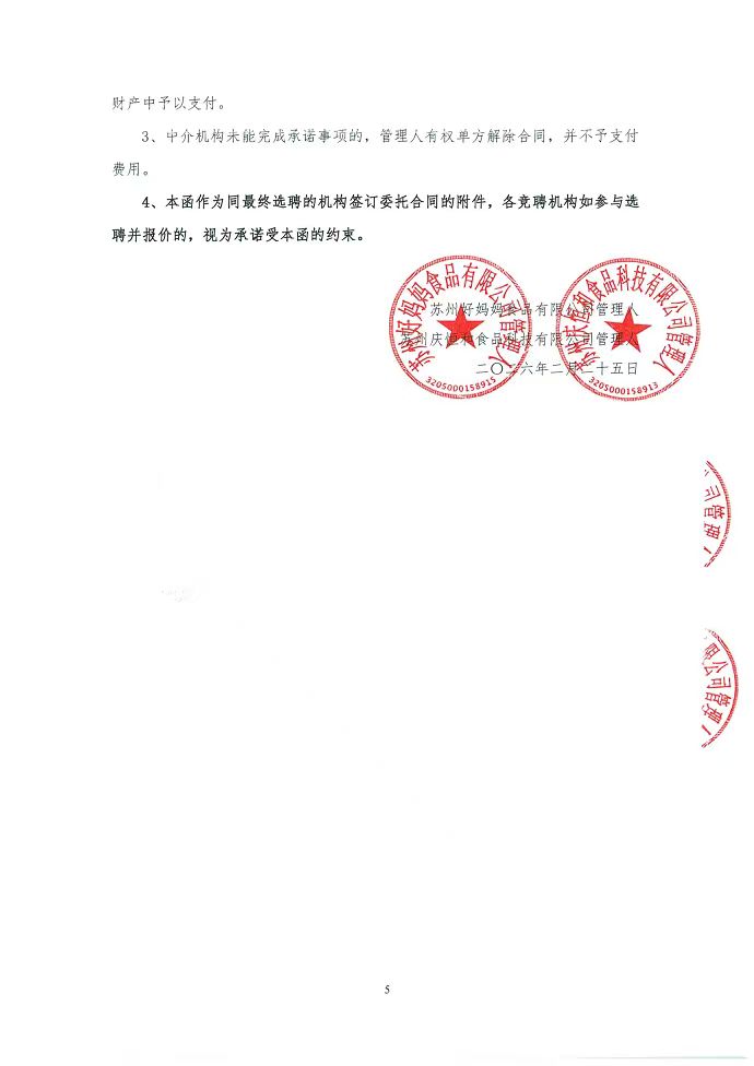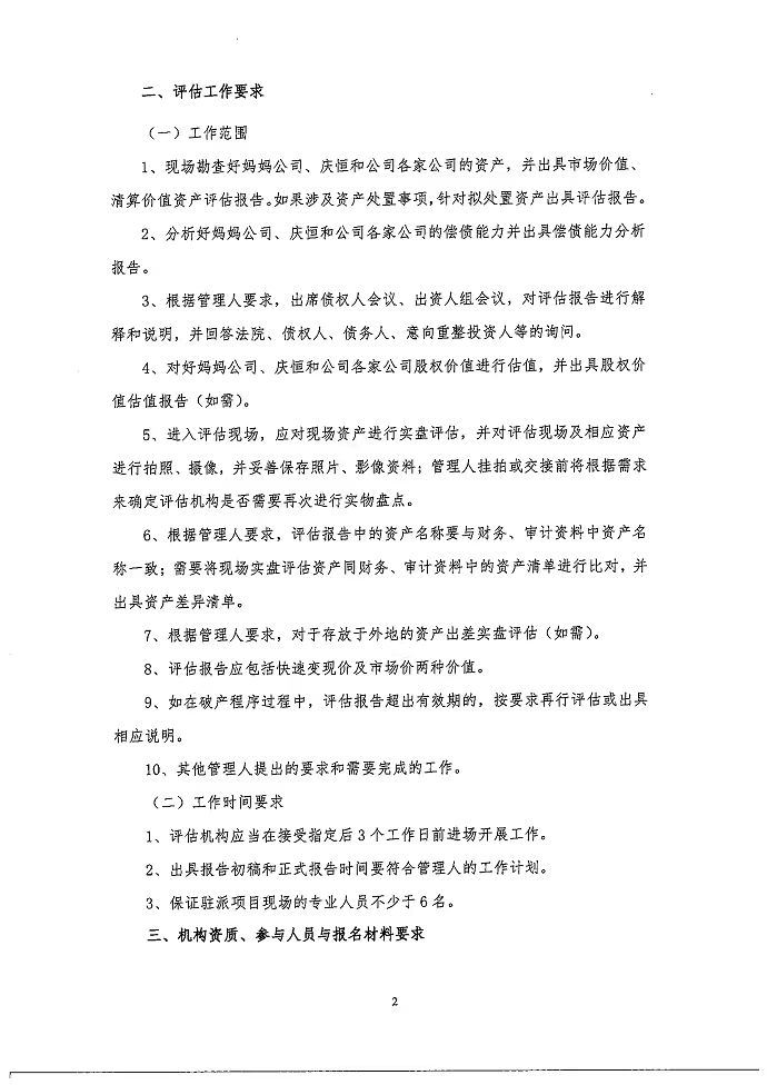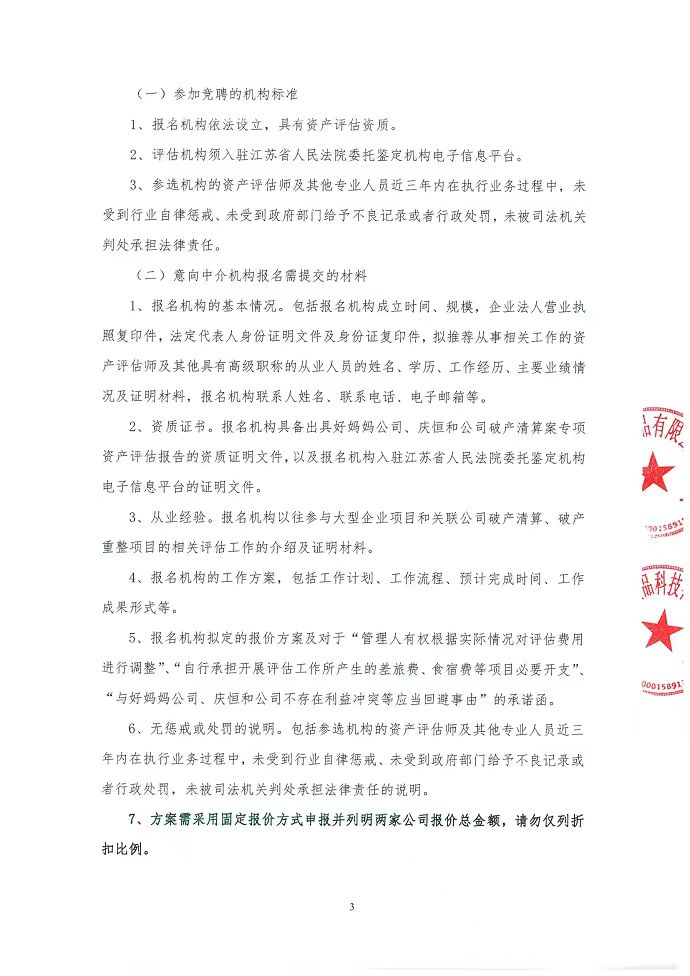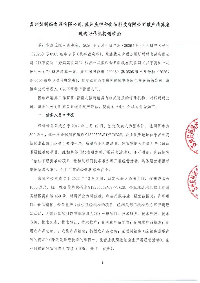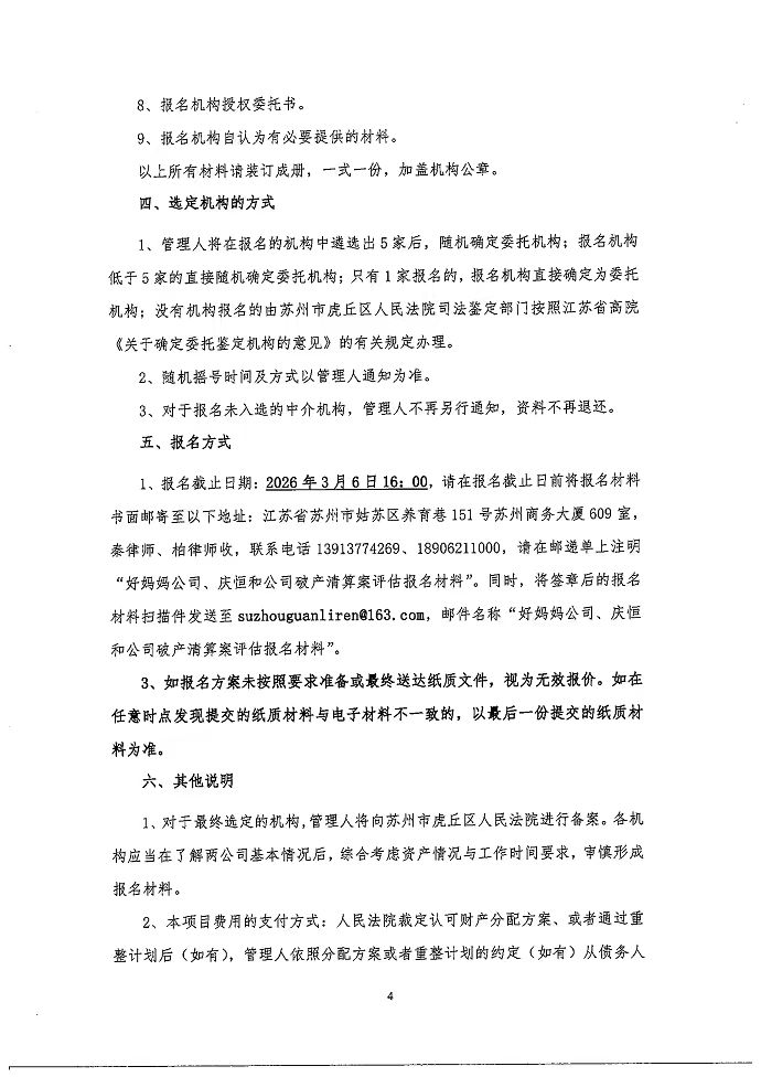 苏州好妈妈食品有限公司、苏州庆恒和食品科技有限公司破产清算案关于遴选评估机构的函