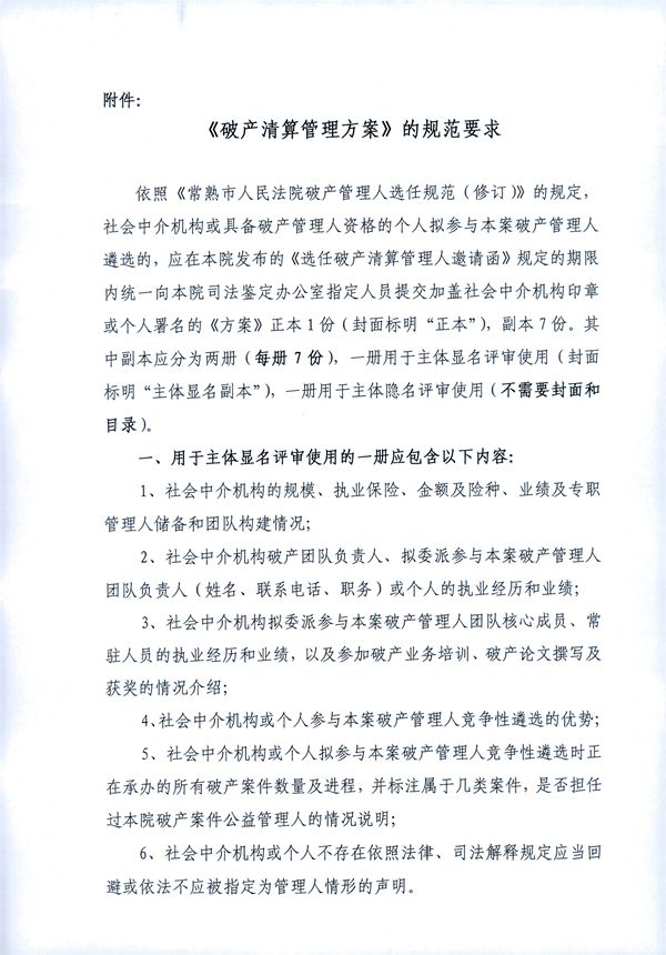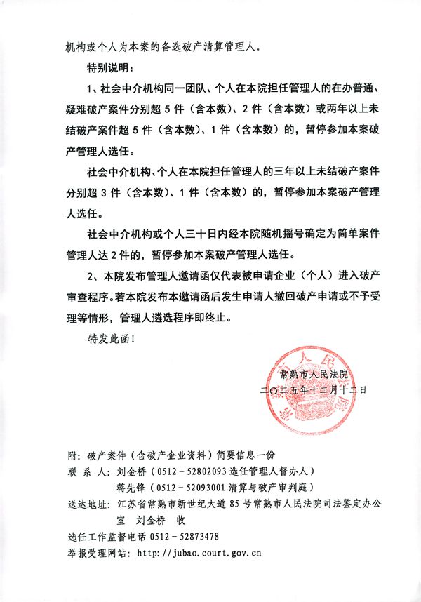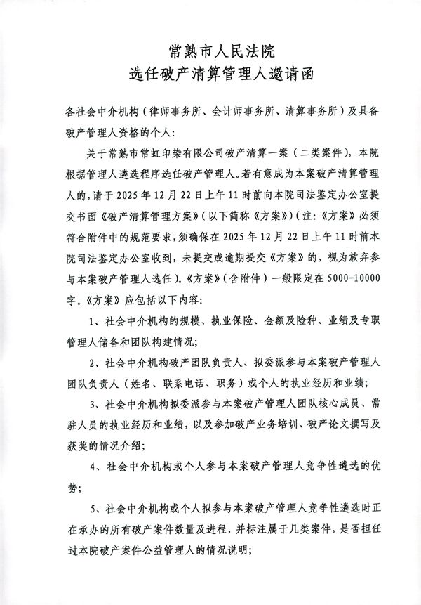 常熟市人民法院选任破产清算管理人邀请函(二类案件)