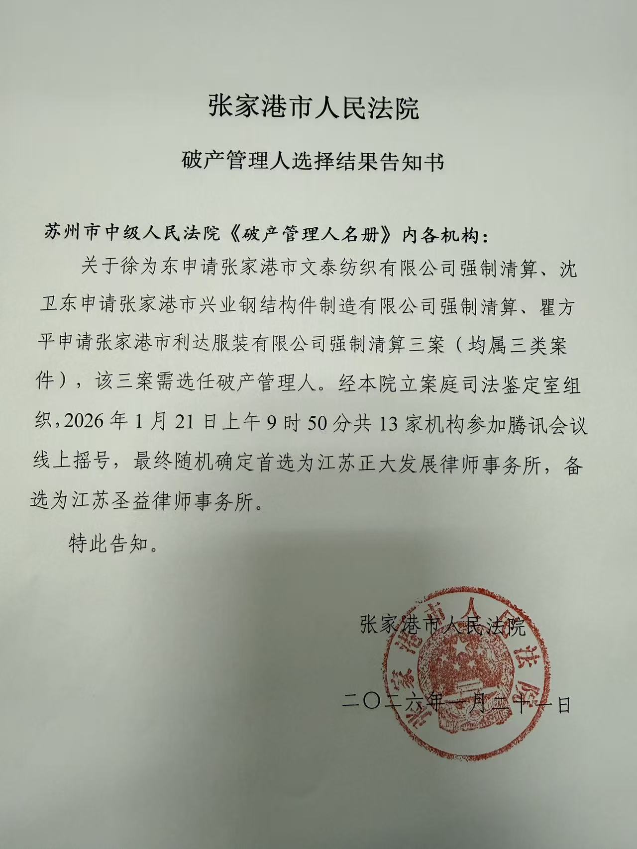 张家港市人民法院选任破产管理人结果告知(清申1-3)